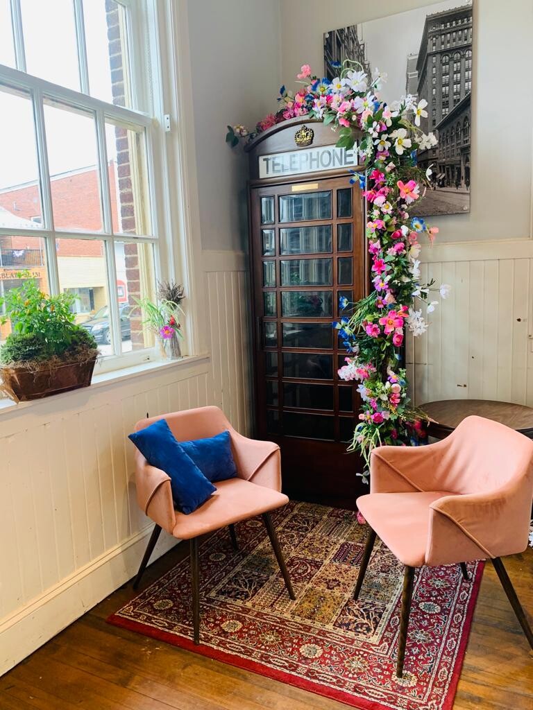 There are peaceful and tastefully decorated private spots to chat with family, friends, or business associates - and sip your coffee. This one has a picturesque view.